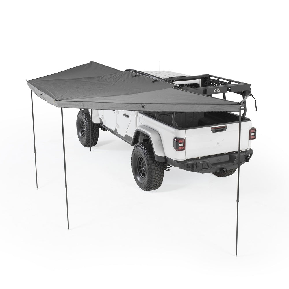 The Smittybilt 180° Awning offers quick and easy setup in seconds, delivering ample sun protection so you can fully enjoy the outdoors. Featuring a sleek, rugged design, this awning is built to withstand the elements with its lightweight extruded aluminum backbone system and self-contained telescopic twist-lock poles. All components are stored in a heavy-duty zippered PVC travel cover to protect your awning during transit. Optional zip-in walls are available to provide extra shade and protection from the elements.